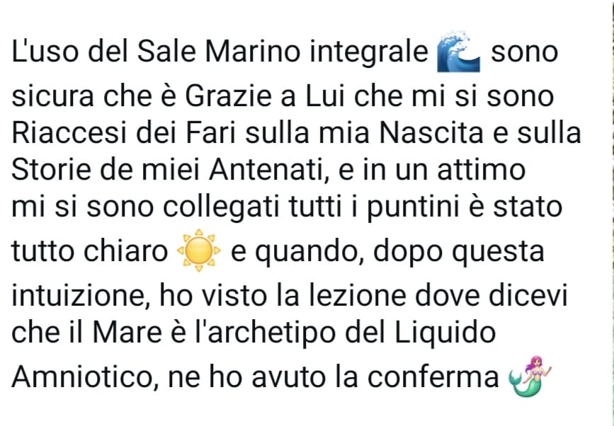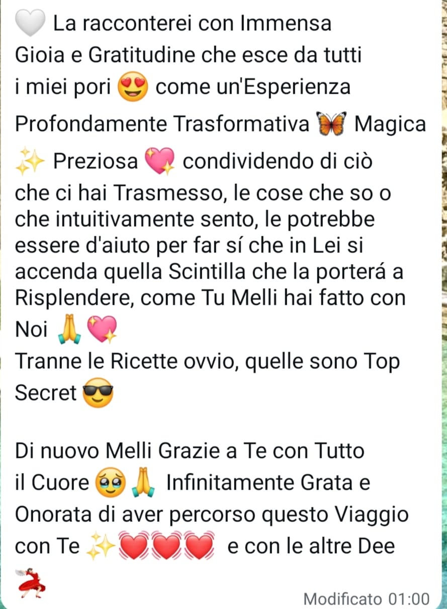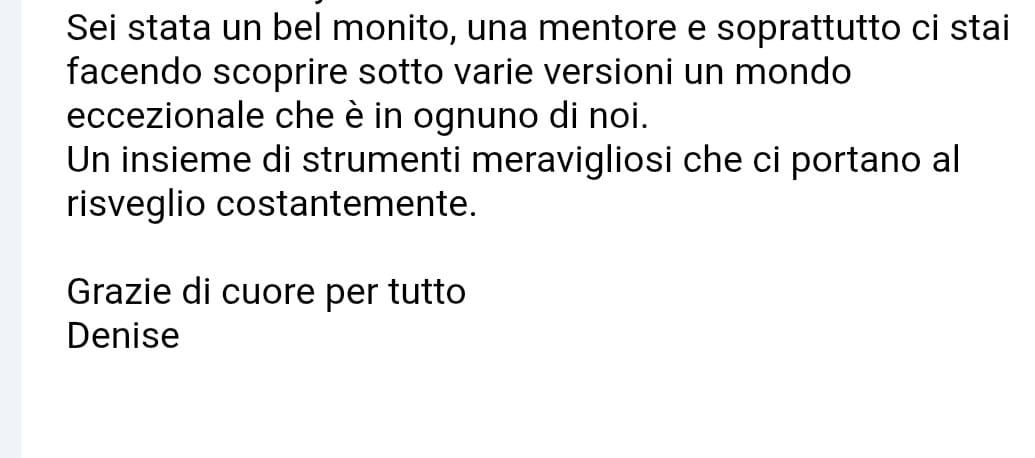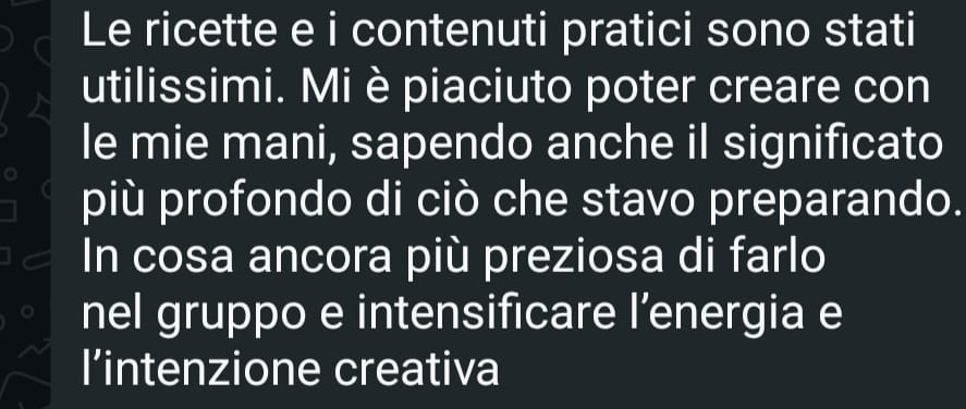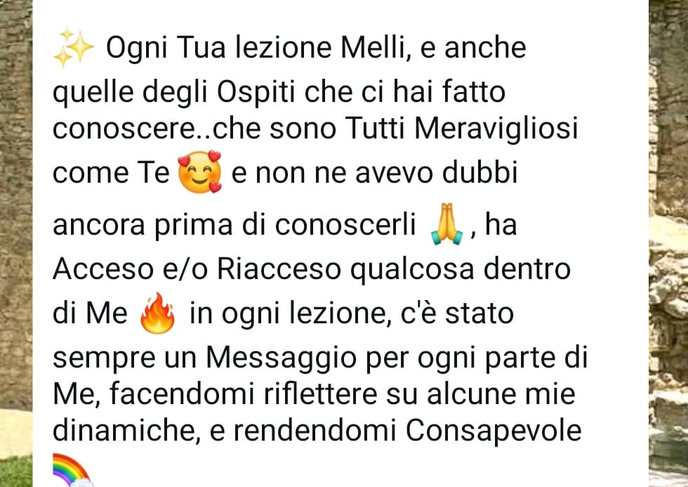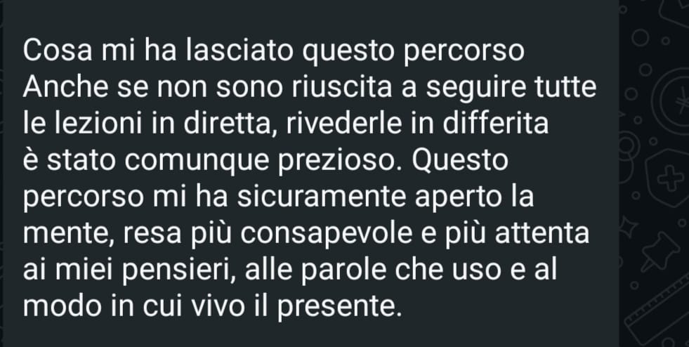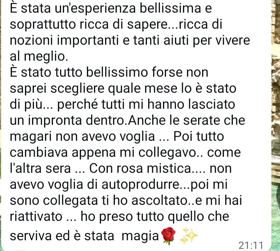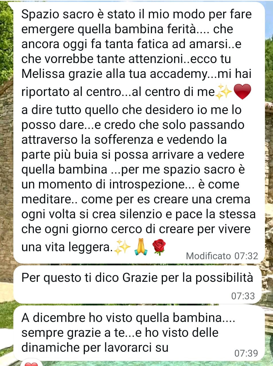 "Un percorso di grande valore, mi ha aperto la via verso una nuova me. Mi ha dato la libertà di togliere le maschere e manifestare chi sono davvero, il mio massimo potenziale Apprezzo tanto il connubio autoproduzione e crescita spirituale"
